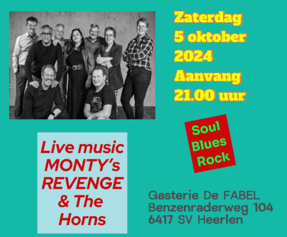 AuthoradminUpdated onaugustus 21, 2024oktober 1, 2024 CategoriesNieuws MR 5 oktober in Gasterie De Fabel Op zaterdag 5 oktober treedt Monty’s Revenge op in Gasterie De Fabel, Benzenraderweg 104 in Heerlen. Aanvang 20:00 uur, entree gratis. Een vrije gift om de kosten te dekken wordt gewaardeerd đ