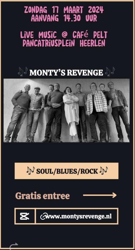 Zondag 17 maart is Monty’s Revenge in volle bezetting, dus inclusief de spetterende horns, te zien en beluisteren in het bekende café Pelt aan het Pancratiusplein in Heerlen. We beginnen om 14:30 uur en de entree is gratis! See you there!